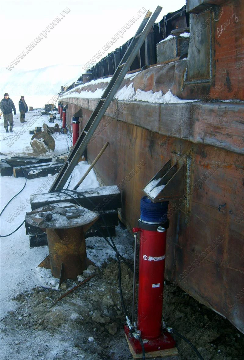 Система подъема «Энерпром» СПРС6/600 «Река» предназначена для подъема и установки на опорные элементы, на период ремонта, речных барж весом до 1100 т методом последовательных поперечных кренов с фиксацией поднятых бортов опорной шпальной решеткой.