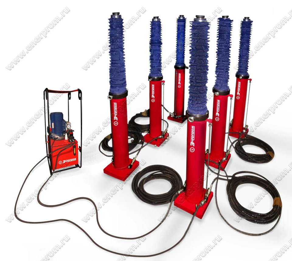 Система «Река» включает: насосную установку и шесть гидравлических домкратов проходного типа, параллельно подключенных к ней посредством РВД с быстроразъемными соединениями, поршневых и штоковых тройников.