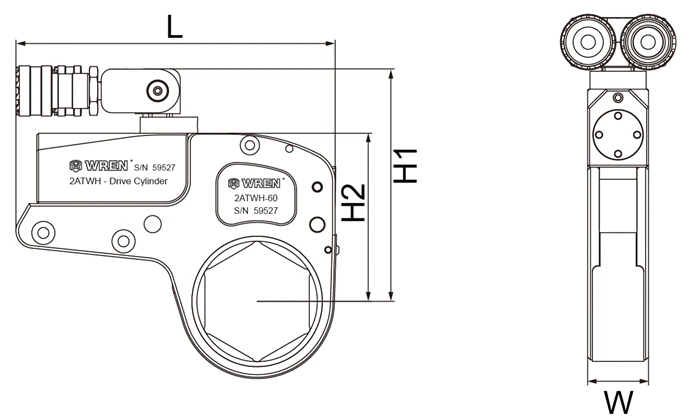 На фото: Габаритный чертеж серии ATWH на примере модели гайковерта 2ATWH-60