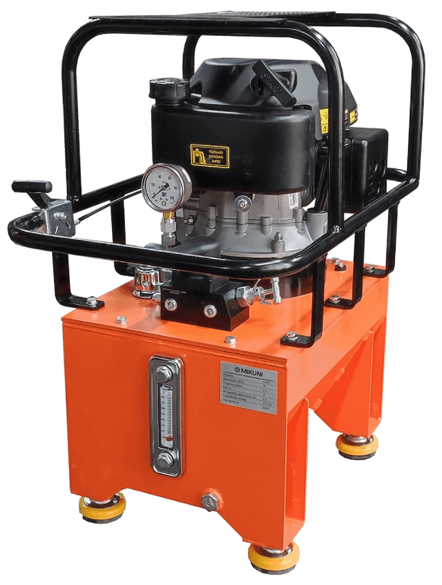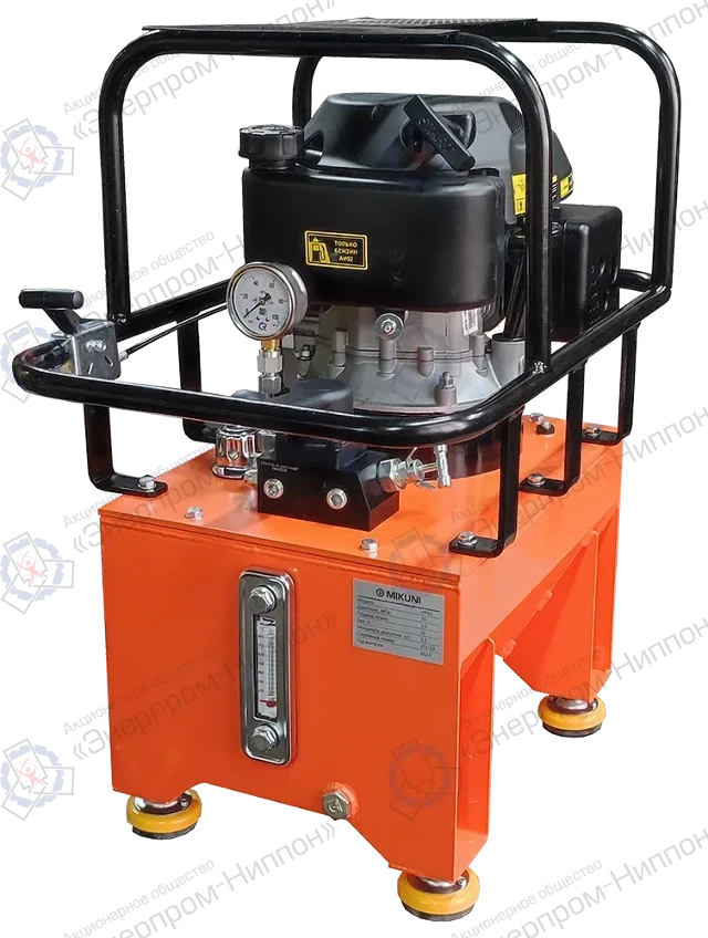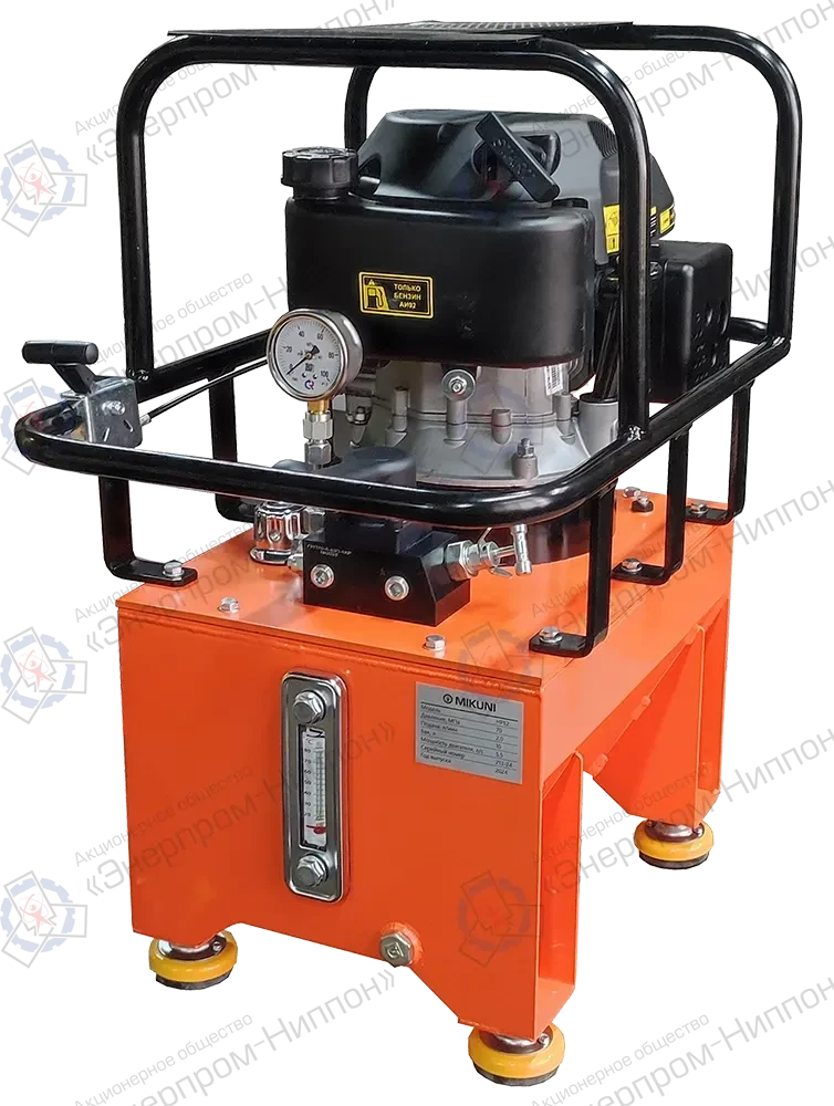 Насосная станция с бензоприводом, ручное управление (трех позиционный распределитель), имеющая конструкцию для переноса (виброопоры). Номинальное давление станции 70 МПа, подача РЖ 2 л/мин, объем бака 10 литров.