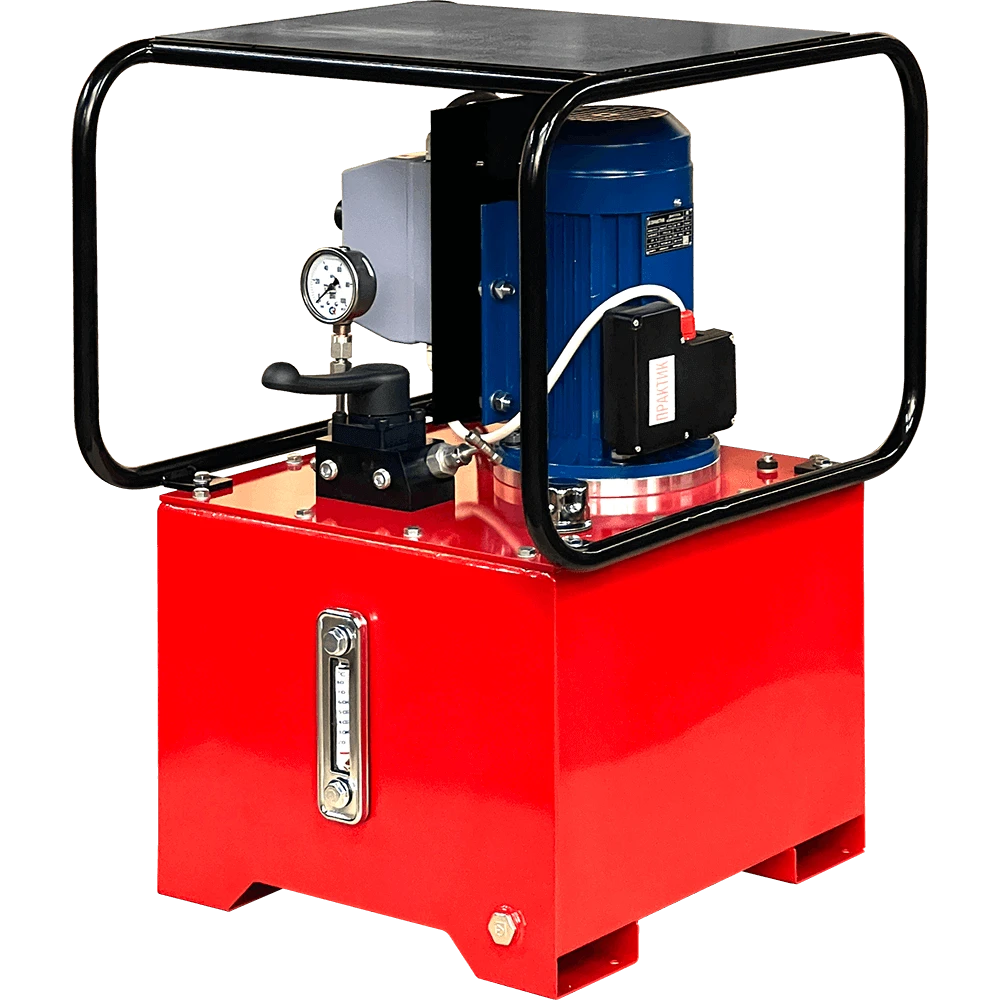Насосная станция с электрическим приводом, ручным управлением, номинальным давлением (по умолчанию) 70 МПа, подачей 6 л/мин, 3-х позиционным гидрораспределителем объемом бака 40 литров, трехфазным электродвигателем 380 В и одноступенчатым насосом.