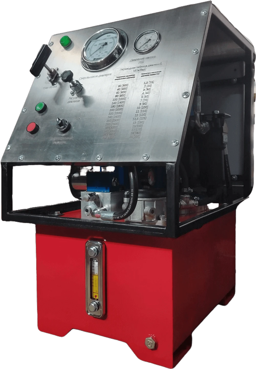 Насосная станция сверхвысокого давления. Номинальное давление 400МПа. Ручное управление на панели. Имеется возможность регулировки давления. Номинальная подача РЖ до 400МПа - 0,5л/мин, объем бака 20 литров. Привод электрический 380В