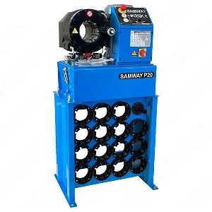 Samway P20Q c электрическим приводом и аналоговым управлением способен развивать давление до 160 т. Предназначен для обжима РВД с внутренним диаметром обжима от 6 мм до 38 мм. Рукав до 1½″ 4SP. Позволяет обжать до 800 рукавов в час. В поставку оборудования входят пресс-формы (кулачки) в количестве 9 комплектов, педаль, стойка-хранилище для кулачков, устройство для быстрой замены кулачков.