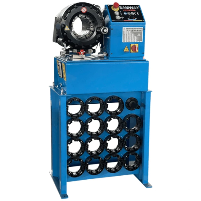 Samway P32Q с электрическим приводом и аналоговым управлением способен развивать давление до 280 т. Предназначен для обжима РВД с внутренним диаметром обжима от 6 мм до 51 мм. Рукав до 2″ 4SP. Производительность составляет 660 единиц в час. В поставку оборудования входят магнитные пресс-формы (кулачки) в количестве 13 комплектов, ножной педалью, стойкой-хранилищем для кулачков, устройством для быстрой замены кулачков.