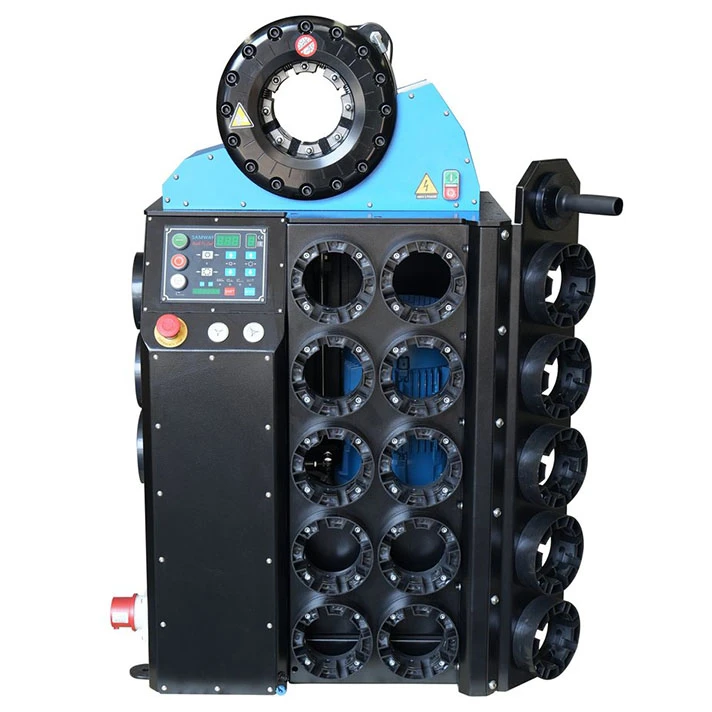 электрическим приводом и цифровым управлением способен развивать давление до 300 т. Предназначен для обжима РВД с внутренним диаметром обжима от 6 мм до 51 мм. Рукав до 2″ 4SP. В поставку оборудования входят пресс-формы (кулачки) в количестве 13 комплектов, ножная педаль, стойка-хранилище для кулачков, устройство для быстрой замены кулачков.