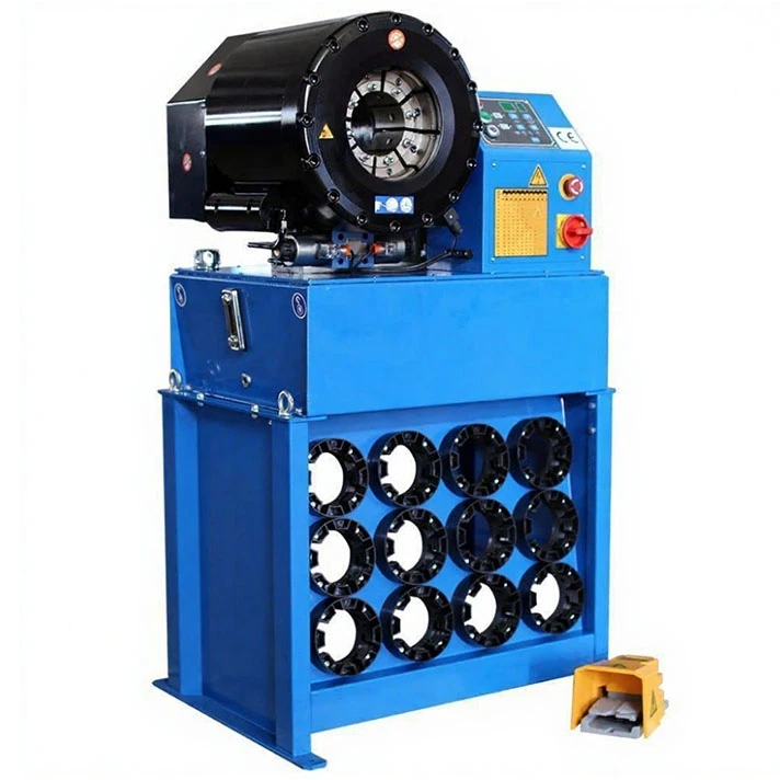 водом и цифровым управлением способен развивать давление до 420 т. Предназначен для обжима РВД с внутренним диаметром обжима от 6 мм до 76 мм. Рукав до 2½″ 4SP. В поставку оборудования входят магнитные пресс-формы (кулачки) в количестве 18 комплектов, ножная педаль, стойка-хранилище для кулачков, устройство для быстрой замены кулачков.