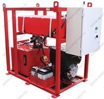 Питание гидросистемы рабочей жидкостью осуществляется 4-мя насосными станциями, две из них НЭЭ(16-32)-МА, с электроприводом, смонтированы на балке поперечной и балке нижней агрегата (7) и две, НЭД1625-МА, с дизельным приводом, на траверсе поднимаемого объекта (6), оснащены дублирующим радиоуправлением (на монтажном агрегате и на понтоне).